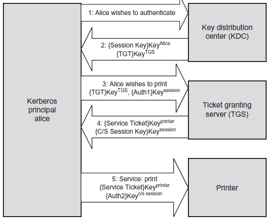 - By way of example, a Kerberos principal, a client run by user Alice, wishes to access a printer. Alice may print after taking these five (simplified) steps: