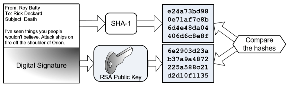 5. You receive the following signed email from Roy. You determine that the email is not authentic, or it has changed since it was sent. In the diagram below, dentify the locally-generated message digest that proves the email lacks non-repudiation.