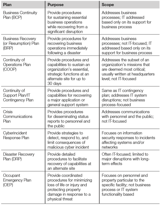 map to a number of different (and sometimes inconsistent) terms and processes described by various BCP/DRP frameworks. - However, a handful of specific frameworks are worth discussing, including NIST SP 800-34, ISO/IEC-27031, and BCI.